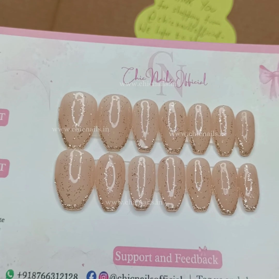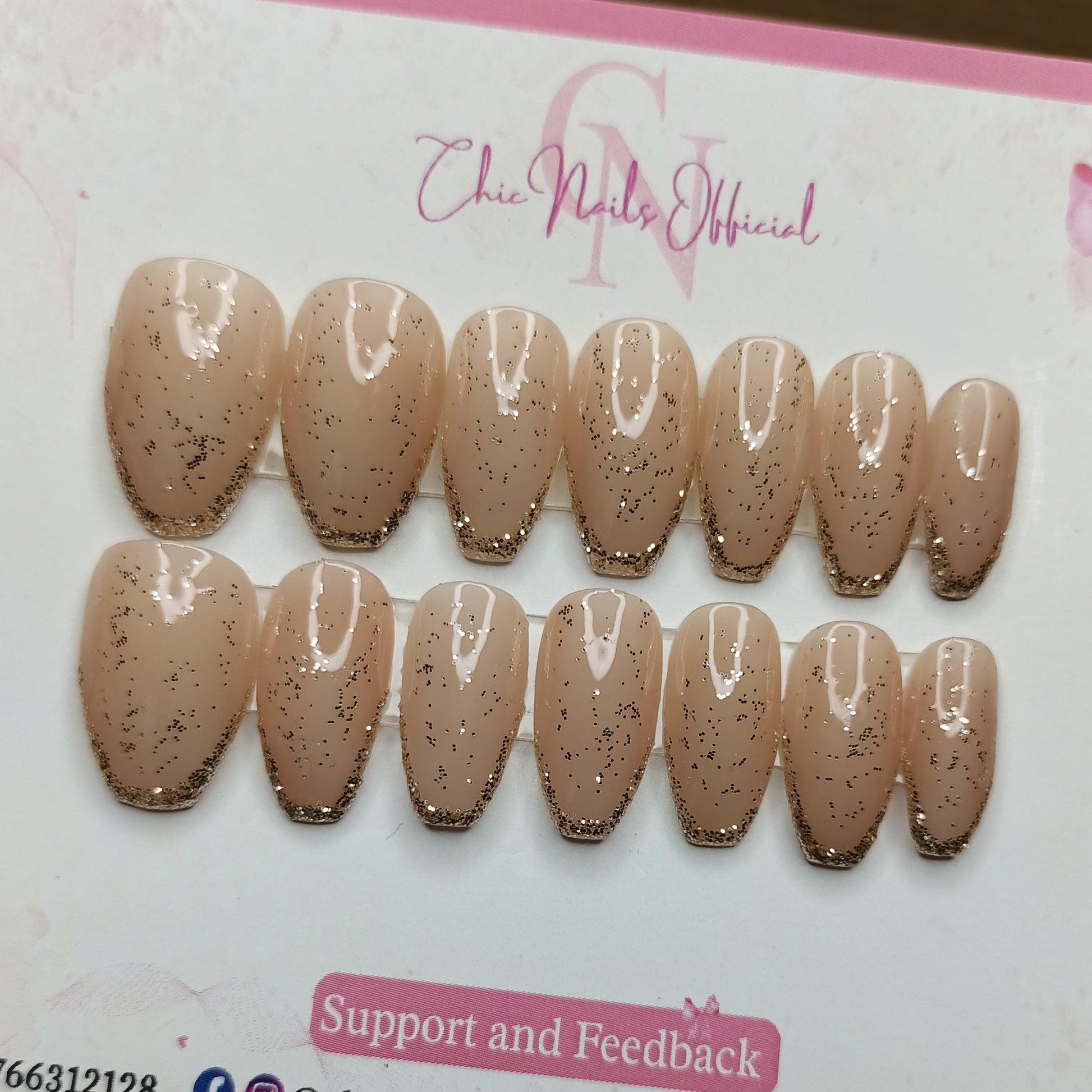 Introducing Golden Glam French Press On Nails — the ultimate blend of elegance and sparkle. These handcrafted press-on nails feature a modern French tip design with a soft beige base and a touch of gold glitter detailing, giving your fingertips a luxurious glow. Perfect for brides, party looks, festive occasions, or everyday glam.