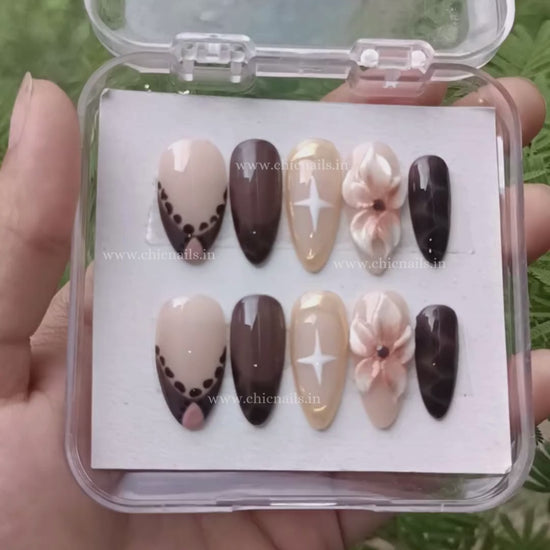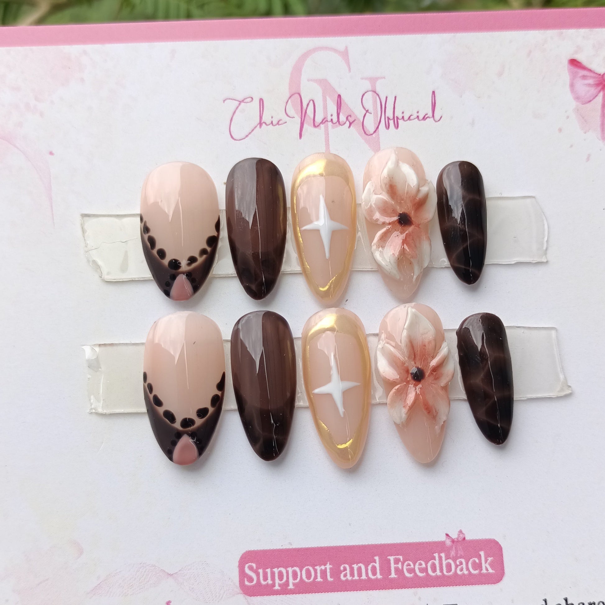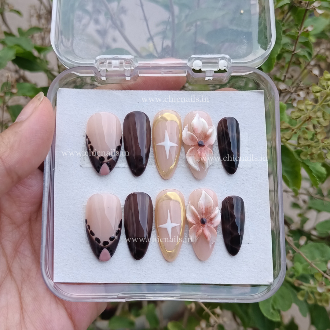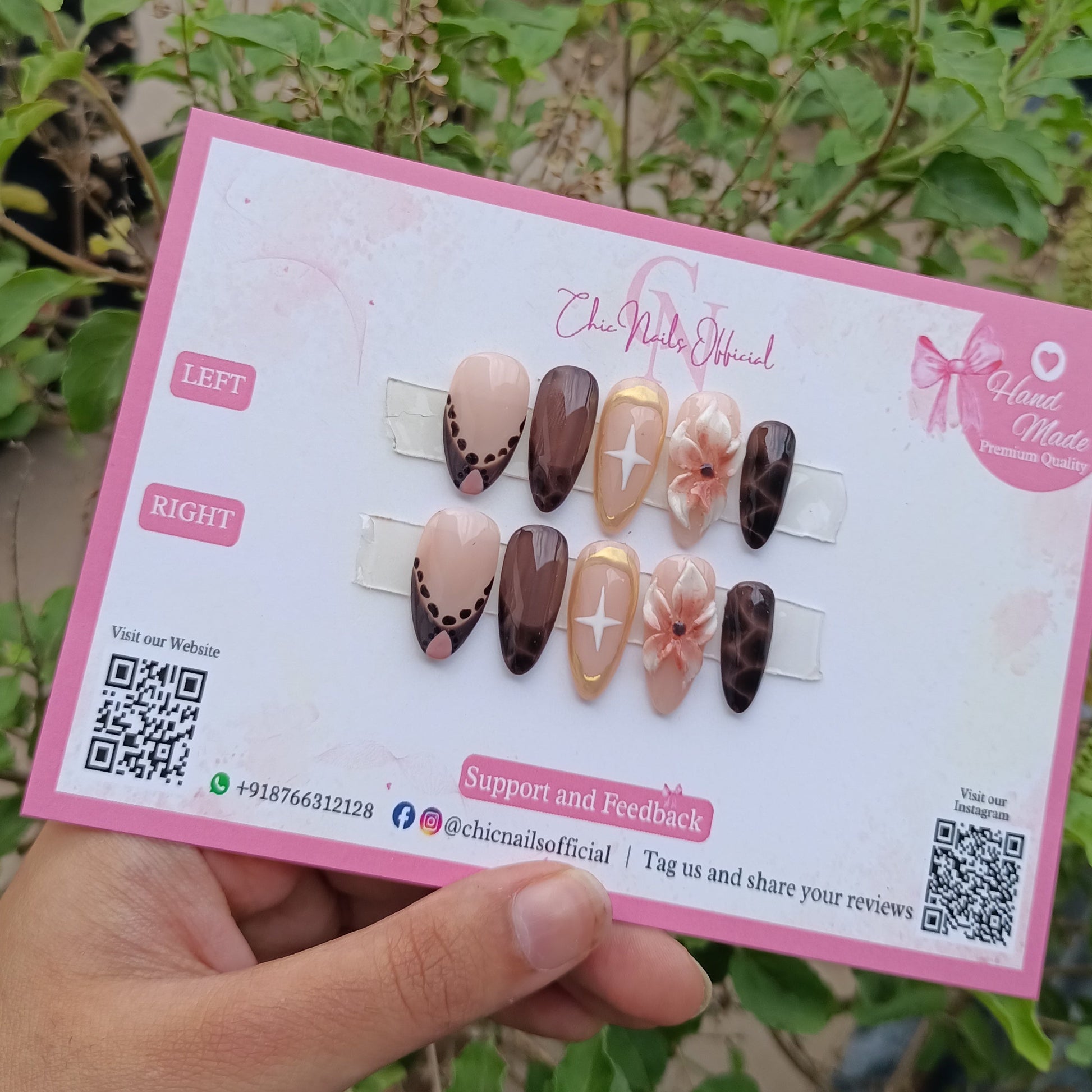 Luxury Luxe Press On Nails are all about class and style. These nails come in soft nude and rich brown shades with gold chrome details, 3D flowers, and a touch of leopard print that gives them a bold yet elegant look.